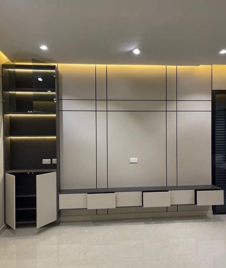 - حتى نزيد من رونق الشيبورد قمنا بتوظيف الإضاءة الخافتة لتتخلل الفواصل، وقد نال هذا التصميم إشادة كبيرة من العملاء.